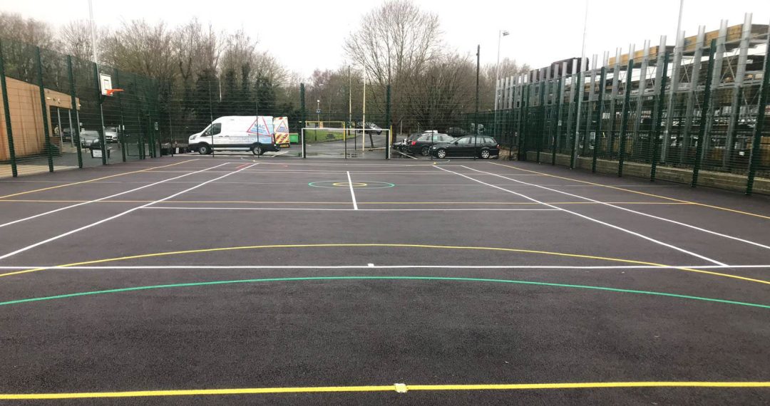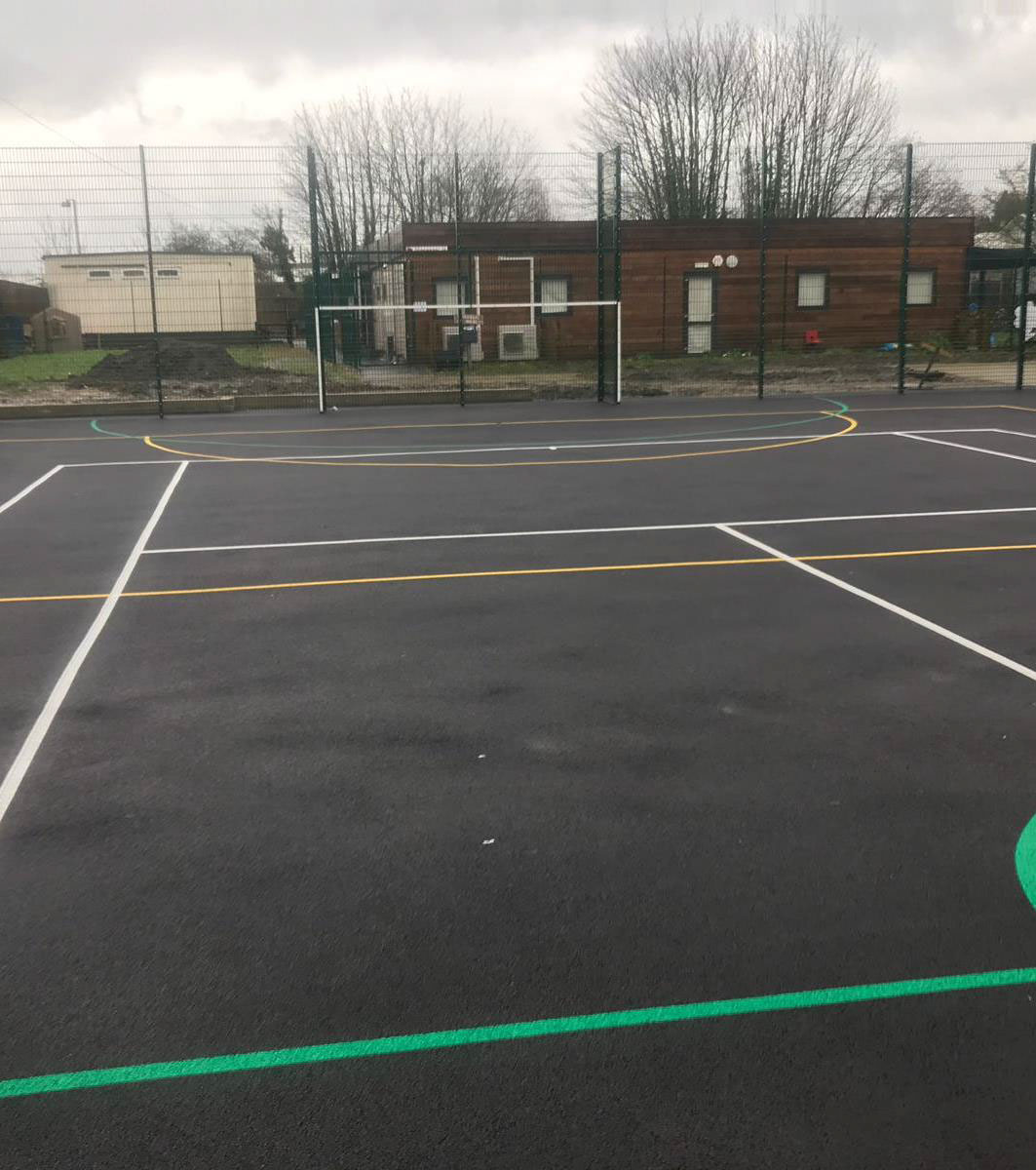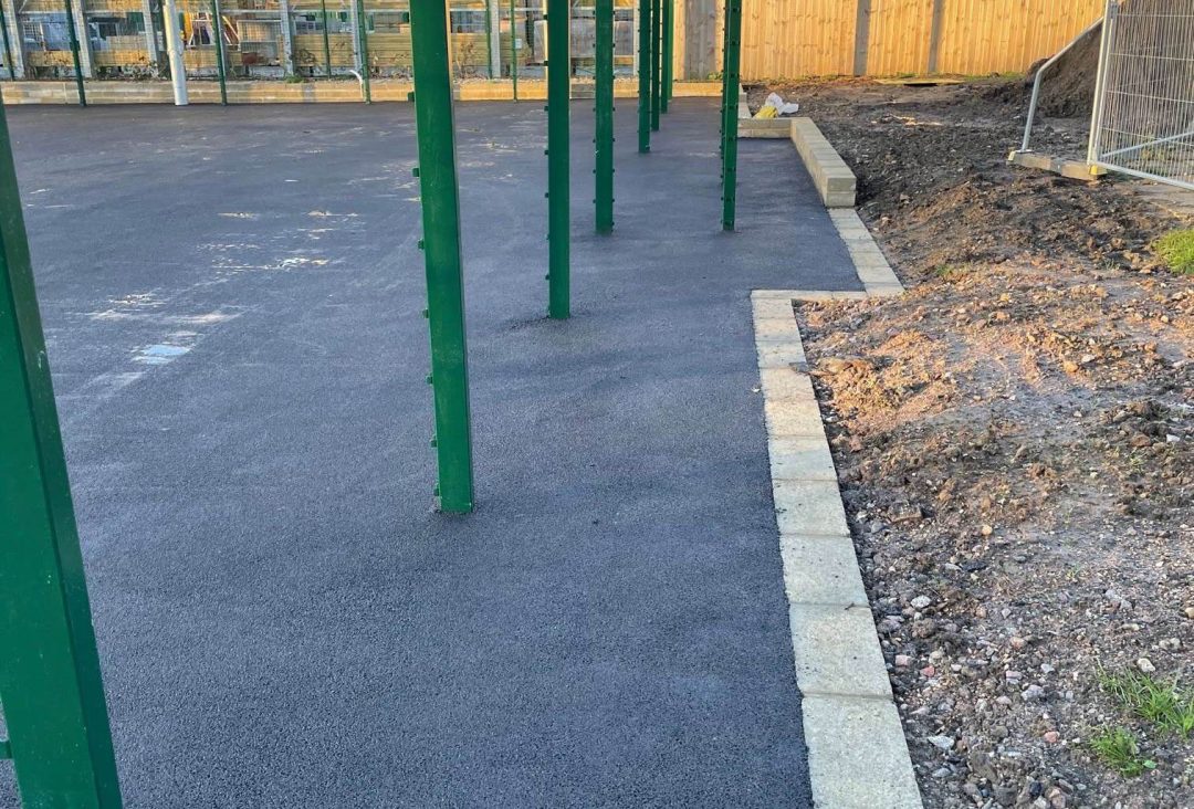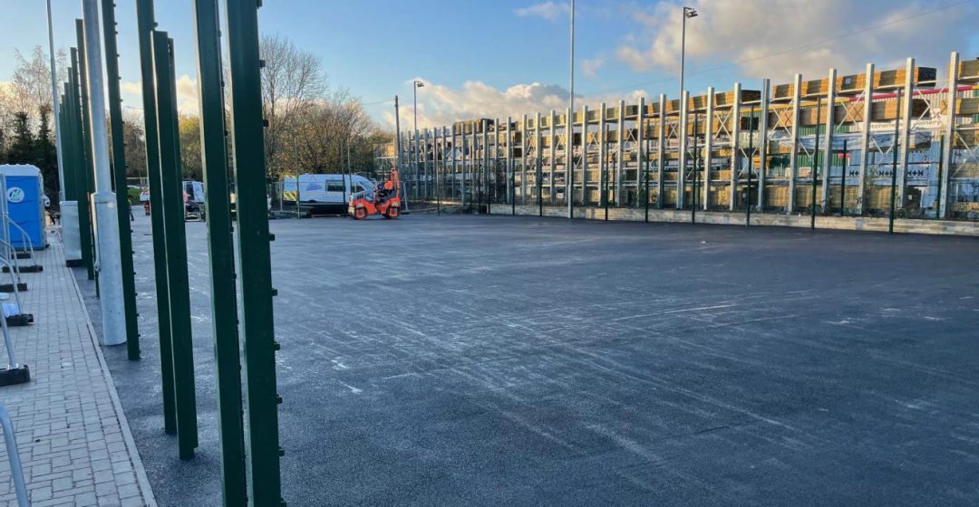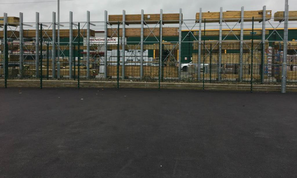 The job involved overlay of an area of 414.25m2 where the existing MUGA was, which required a ‘clean-up’ before overlaying, along with the extended area of the MUGA, which was 397m2 and installation of a 26m Retaining Wall. We excavated to reduce the levels and compacted, installed geotextile membrane and compact Type 1 to make up the levels and compact the filling. The extension to the MUGA then had 20mm Open Texture Base Course laid at 40mm thick. The whole ‘new’ area of 811m2 was completed with a 6mm Courtmaster Surface Course. We then installed a 4m High MUGA Fencing.
